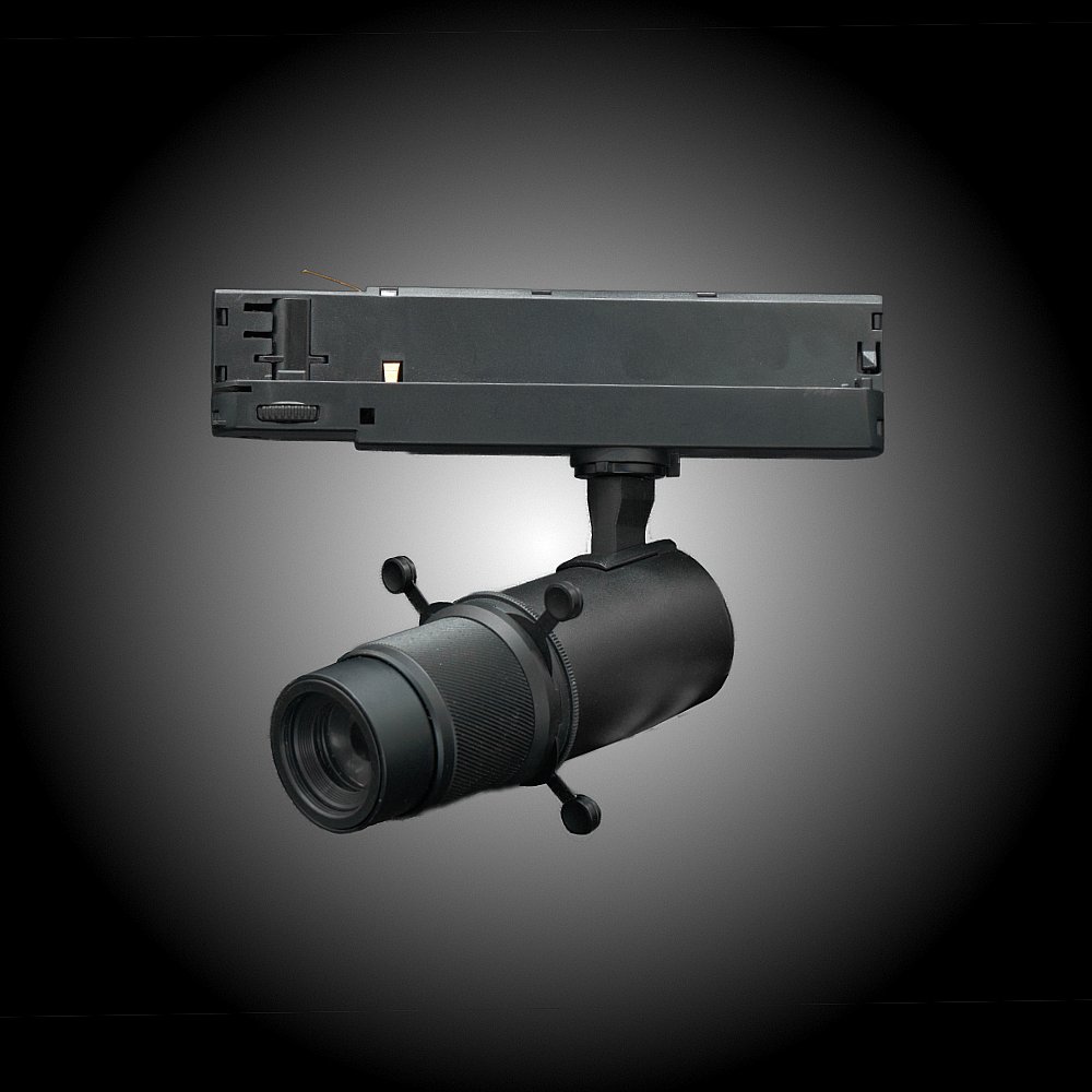Profilarmatur på 10 W med 20-35° zoom. Roterbart spadpaket och möjlighet att montera gobo.