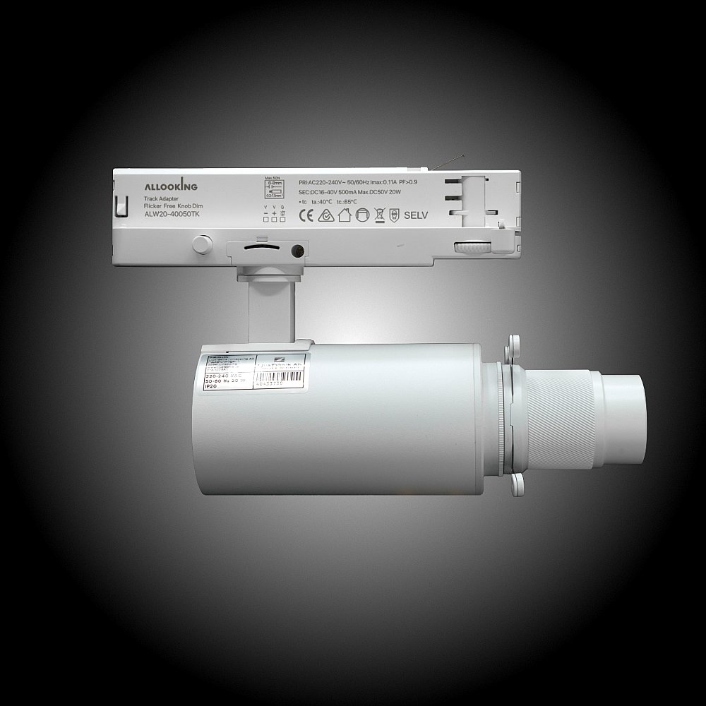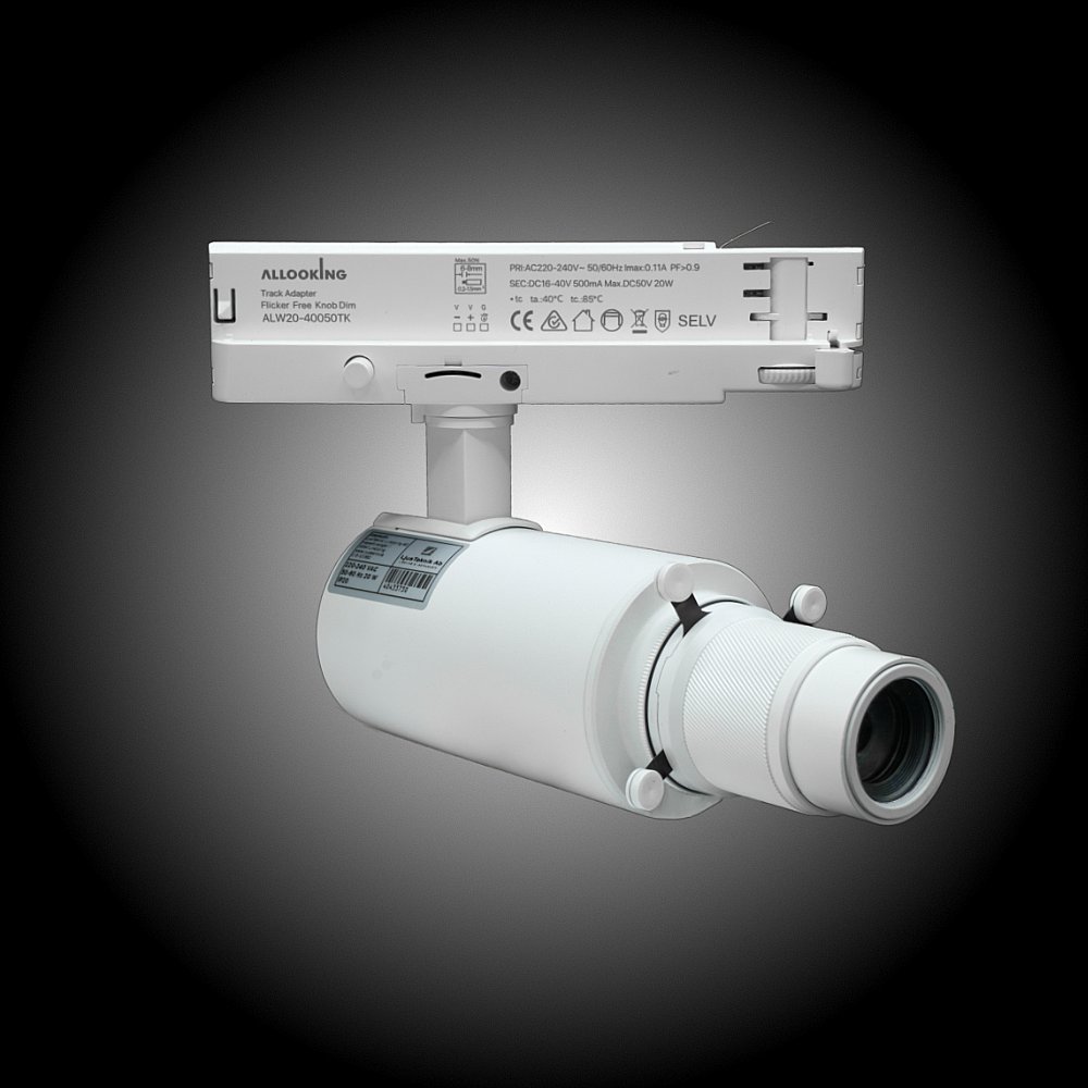 LED COB på 1880 lumen och CRI Ra 97. - Enkelt att justera spridningsvinkel via zoom-optik på 20-35°. - Inbyggd dimmer som regleras med en potentiometer. - Multiadapter som passar de vanligaste skenorna på marknaden. Enkel fasväljare. - Armaturhus i aluminium för bästa kylning. - 5 års garanti på armatur, drivdon och LED-chip. - Finns i vitt och svart. Andra färger som beställningsvara. - LED ger låg strålning av UV och IR. - Möjligt att montera gobo. - Specialvarianter med andra typer av LED-chip, drivdon och infästningar finns som beställningsvaror.